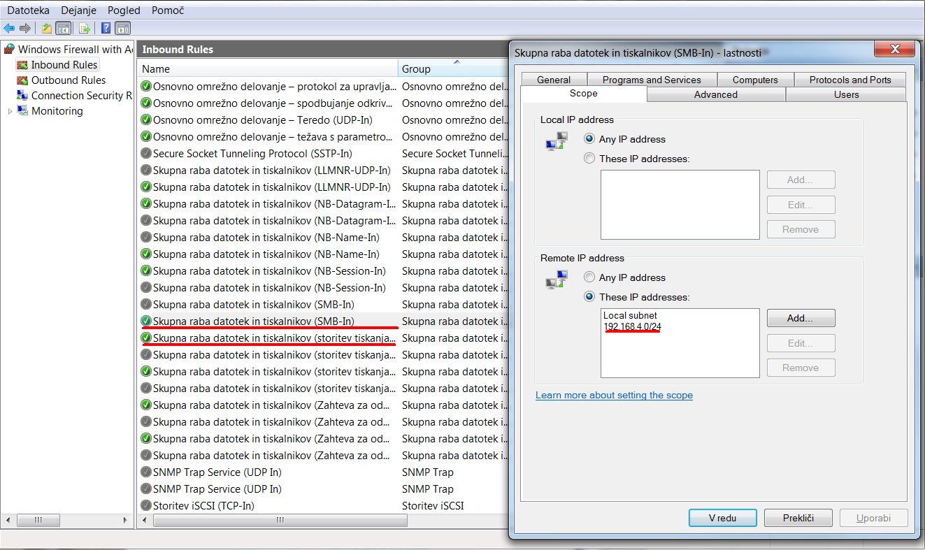 Če hočemo, da laptop(192.168.4.10) na 1. sliki dostopa do datotek v skupni rabi računalnika triglav(192.168.2.4), moramo požarni zid računalnika triglav nastaviti takole (Windows 7) :