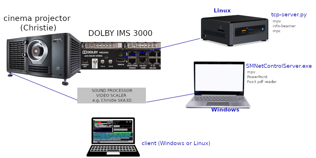 Client application talks to both servers and IMS3000. It may help you to do things a little easier in a multi-purpose theatre.
