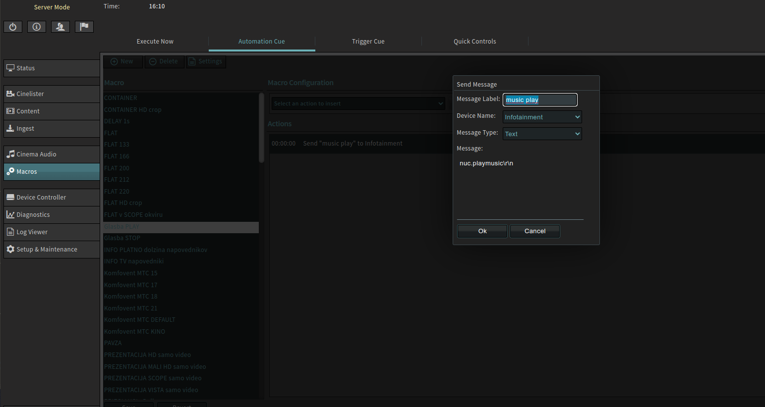 Let's start with projector macros first. You can skip this step if you don't know network commands for your projector, because everything can be done via IMS3000 macros. There are already two projector macros included in the ~/kino-player/_scripts directory: projector_FLAT and projector_SCOPE. As already mentioned in the Linux server section, these are one line scripts for channel change on Christie projectors.